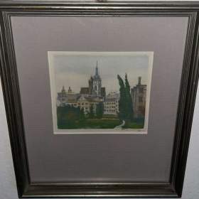 Celkové rozměry včetně rámu cca 32 cm x 28 cm. Rám má místy otluky. Barevný originální lept na papíře. Obraz je zasklený. Celkový stav - viz foto.