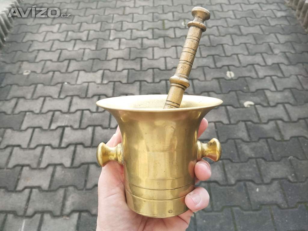 Velký starý mosazný hmoždíř č. 13 ! ! s tloukemVýška samotného hmoždíře: 15cm. Výška s tloukem 24cm. Délka samotneho tlouku……