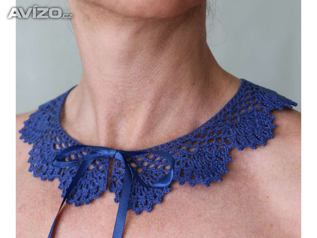 Pavučinkový jemný ručně pletený límeček, na šaty nebo jako šperk přímo na tělo. Zapíná se na ouško a knoflík. Délka od krku po……