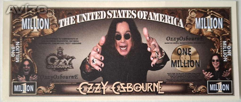 Nabízím novou pamětní bankovku 1000000 USD legendární skupiny BLACK SABBATH zpěvák OZZY OSBOURNE *3. Prosince 1948 - †22……