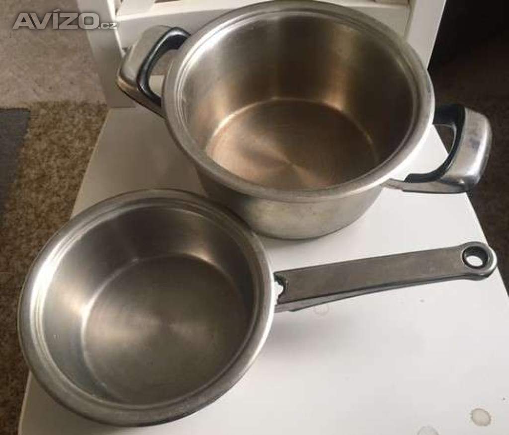 Menší, průměr dna 14 cm, se 2 poklicemi, cena 800,-Kč.