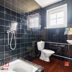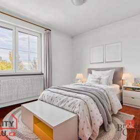 V patře jsou k dispozici tři samostatné pokoje, přičemž z jednoho je vstup na prostornou terasu o velikosti 20 m², která nabízí příjemné soukromí, možnost posezení a krásný výhled do okolí. Také zde je druhá koupelna se sprchovým koutem a toaletou.