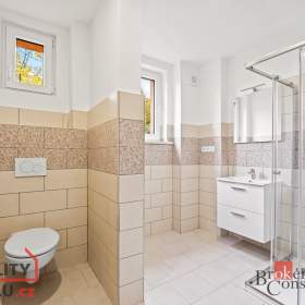V koupelně jsou nové obklady, sprchový kout, topný žebřík, umyvadlo s úložnou skříňkou, zrcadlem, dále připojení na pračku i sušičku a WC odděleno příčkou.