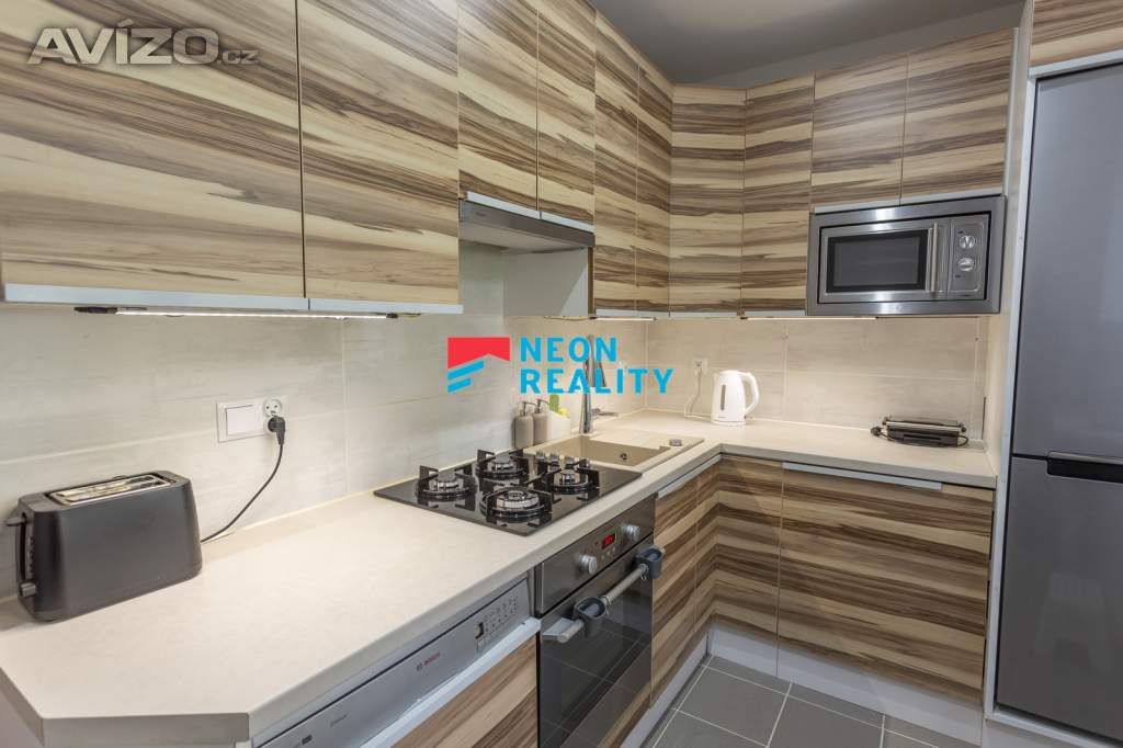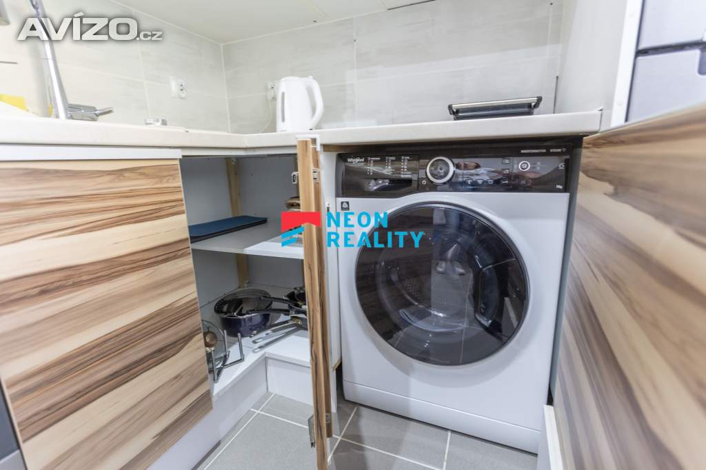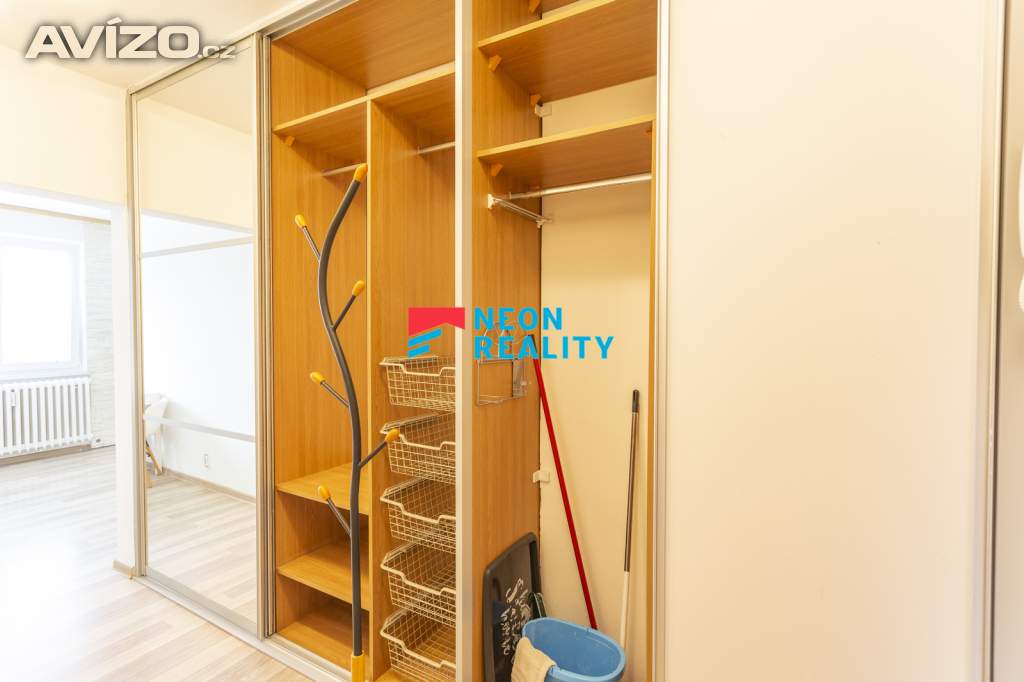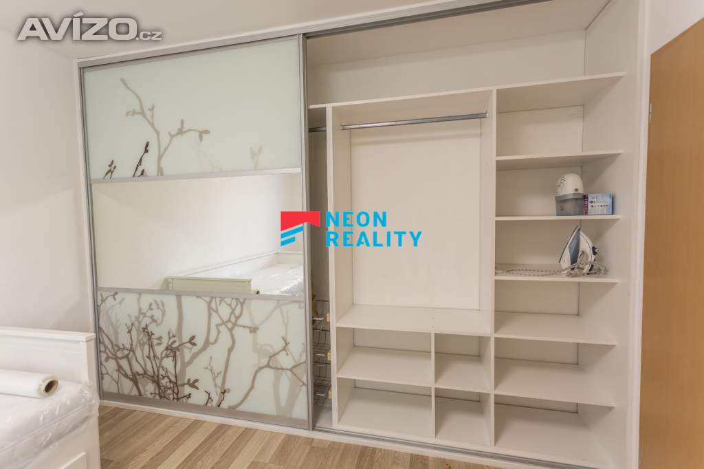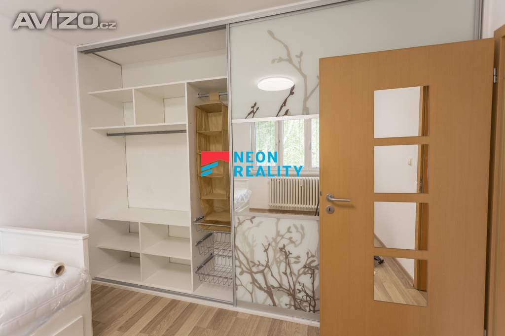 Interiér působí světlým a vzdušným dojmem. Obývací pokoj je vybaven sedačkou, konferenčním stolkem, obývací stěnou s TV, pracovním místem a jídelním stolem. Z pokoje je také přímý vstup na lodžii. Ložnice nabízí prostor pro klidný odpočinek, kuchyně je prakticky zařízená a vybavená veškerými spotřebiči. V chodbě i v pokoji jsou velké vestavěné skříně, které poskytují dostatek úložného prostoru. Koupelna po úpravách je vybavena vanou se zástěnou, toaleta je samostatná. Veškerý nábytek z fotografií je součástí nájmu – stačí si přivést postel a můžete se ihned nastěhovat. Pračka je umístěná v kuchyně, sušička v obývacím pokoji.